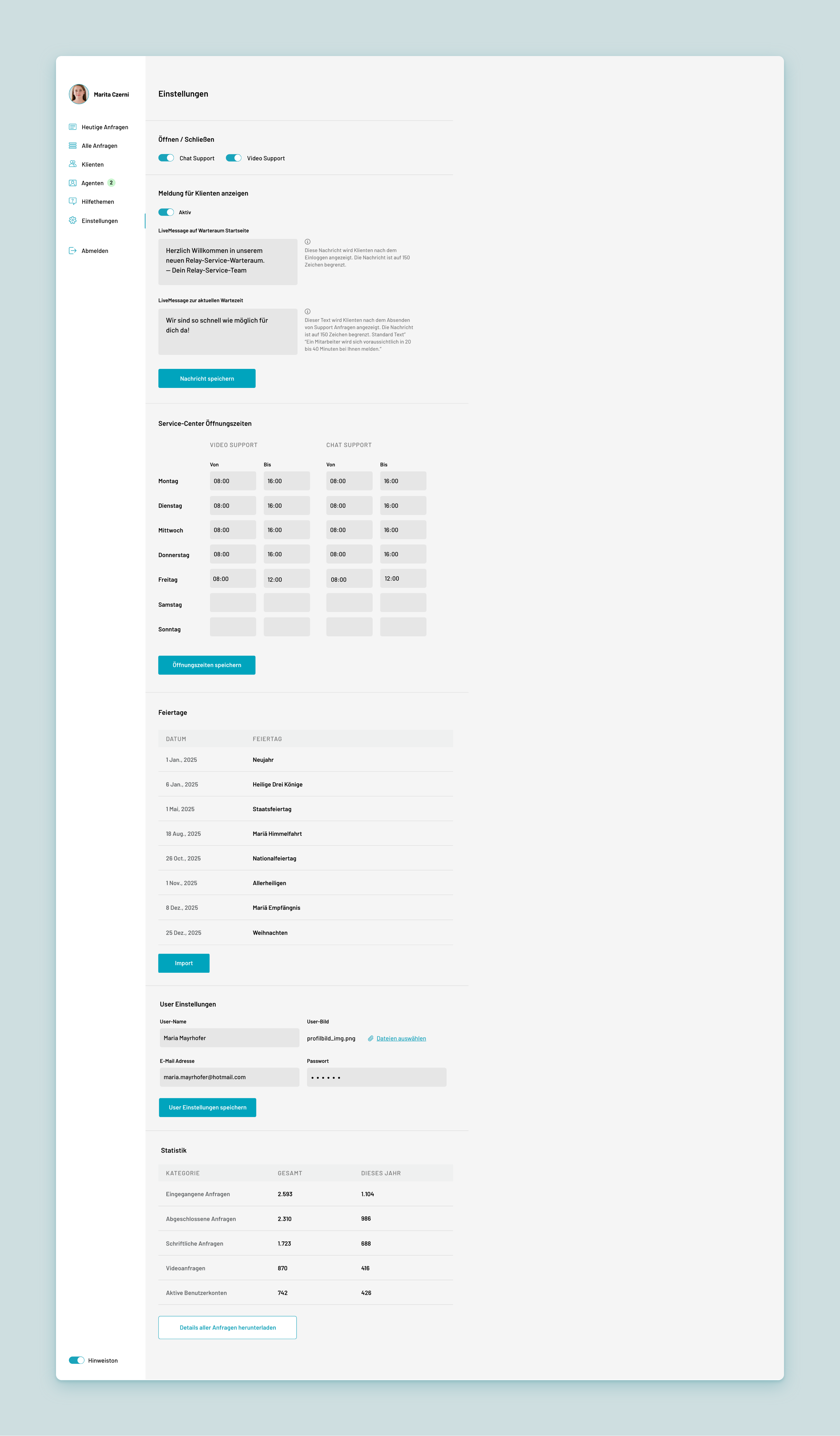 - Management of clients, agents, help articles, opening hours, and more